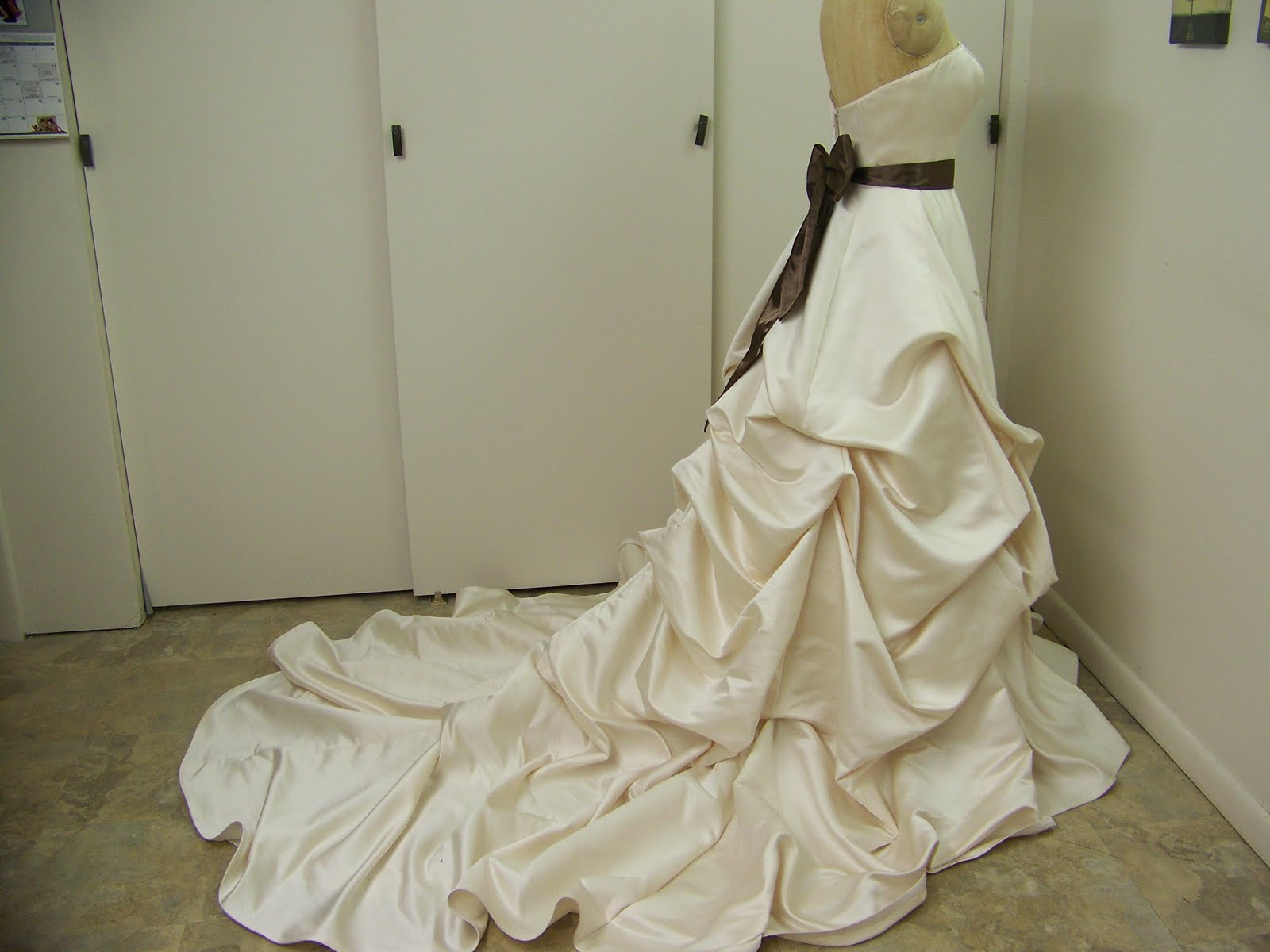 The whole dress is made with hand sewn stitches. The edges of the shoulder ruffles has wiring to secure the look.